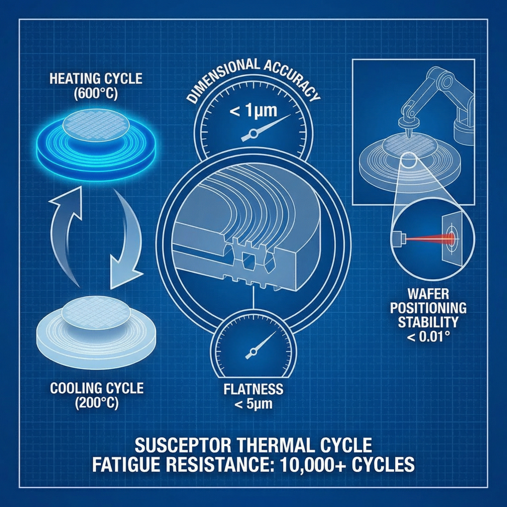 Kvaliteetsetel sustseptoritel peab olema suurepärane vastupidavus termilise tsükli väsimusele. Pikaajaliste kuumutamis- ja jahutamistsüklite ajal peab sustseptor säilitama mõõtmete täpsuse ja tasasuse, et vältida mehaanilisest moonutusest põhjustatud vahvlite positsioneerimise kõrvalekaldeid, tagades sellega, et iga partii saagis jääb eeldatavale lähtetasemele. Premium-sustseptoritel peab olema suurepärane vastupidavus termilise tsükli väsimusele. Pikaajaliste kuumutamis- ja jahutamistsüklite ajal peab sustseptor säilitama mõõtmete täpsuse ja tasasuse, et vältida mehaanilistest moonutustest põhjustatud plaatide asukoha kõrvalekaldeid, tagades sellega, et iga partii saagis jääb eeldatavale lähtetasemele.